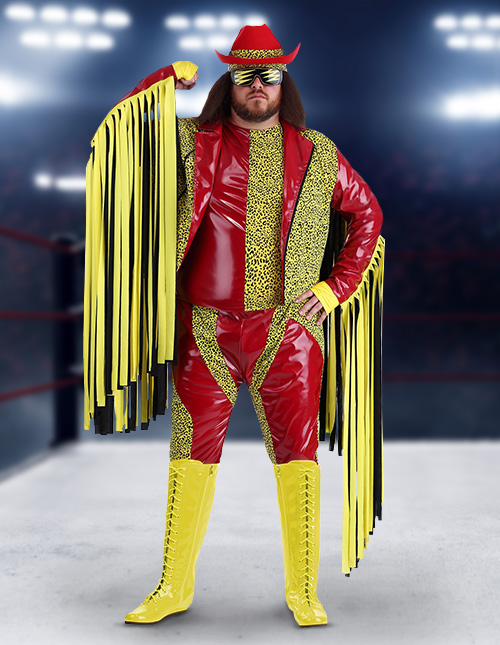 When it comes to our top-performing men's costumes year after year, we just have to look to one of the all-time top performers from the WWE. Oooh yeah! The Macho Man Randy Savage is one of the most iconic professional wrestlers of all time. He's well-remembered for his amazing outfits, epic moves in the ring, and of course, legendary backstage rants riddled with "Oooh yeahs!" Well, if you're a big and tall guy who's always wondered what you'd look like in a Macho Man costume, wonder no longer. Just get our Plus Size Randy Savage Costume to play the part! With faux red leather, a cheetah print, and lots of flamboyant fringe, we're sure you'll love our exclusive costume. It's WWE officially licensed and features one of his signature looks. It comes with a red cowboy hat, and we have a Macho Man wig and beard available separately. You'll be on your own, though, to supply the raspy voice for the role!